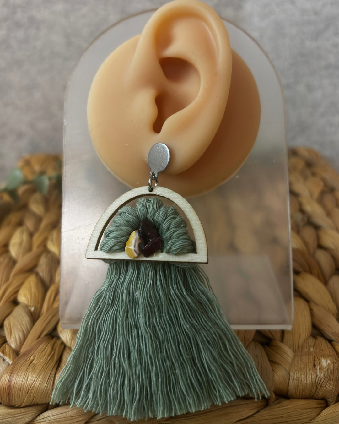 Tejidos a mano en tono verde salvia y adornados con Mokaita Jasper, esta pieza te invita a enraizarte, confiar en tu camino y tomar decisiones con presencia y sabiduría.