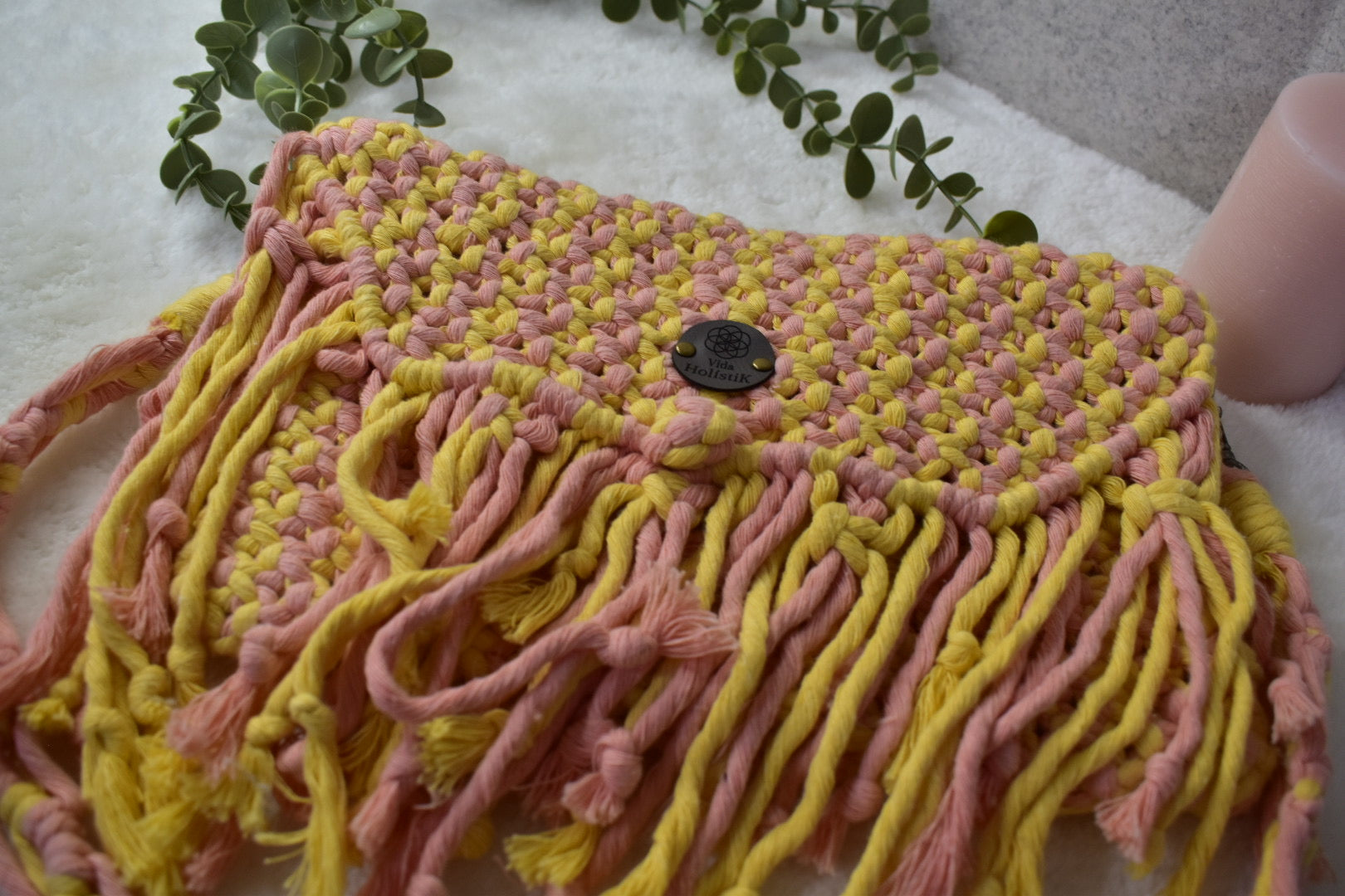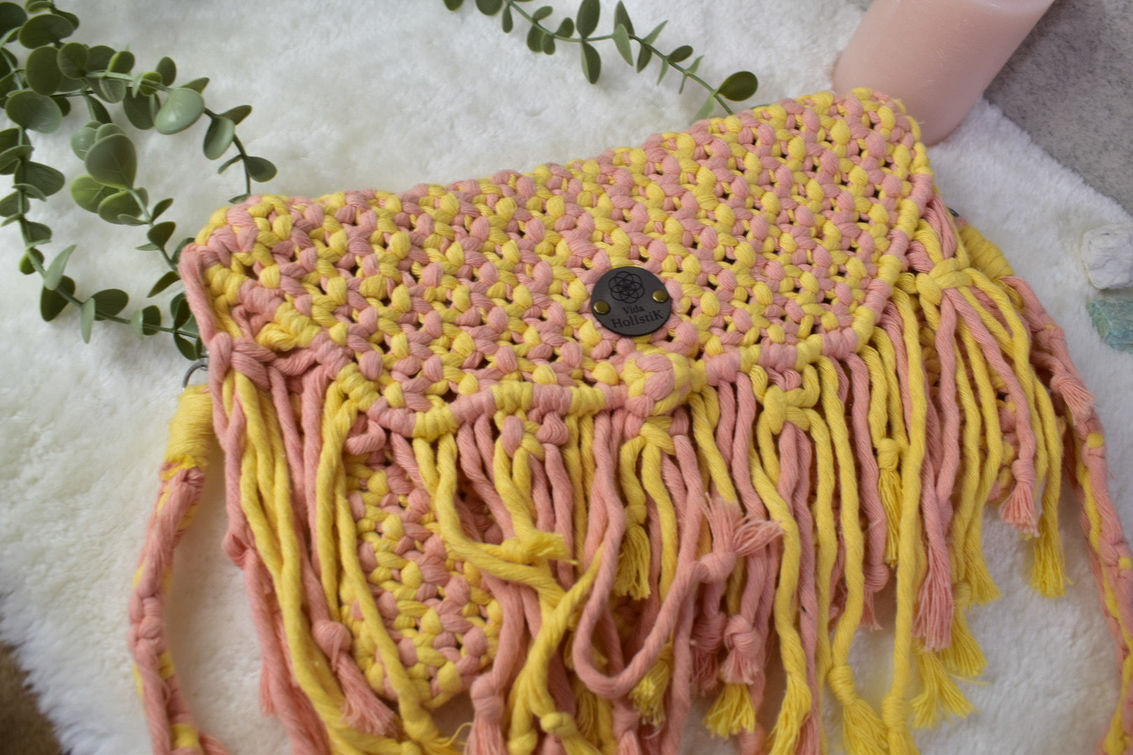 La Cartera Amanecer está inspirada en los primeros rayos del sol, con tonos cálidos en rosa y amarillo que transmiten alegría y energía positiva. Tejida a mano en macramé con fibras de algodón resistentes, su diseño boho con flecos la convierte en una pieza única y auténtica. Es ligera, práctica y versátil: perfecta para complementar tu look diario o darle un toque especial a tus salidas.”