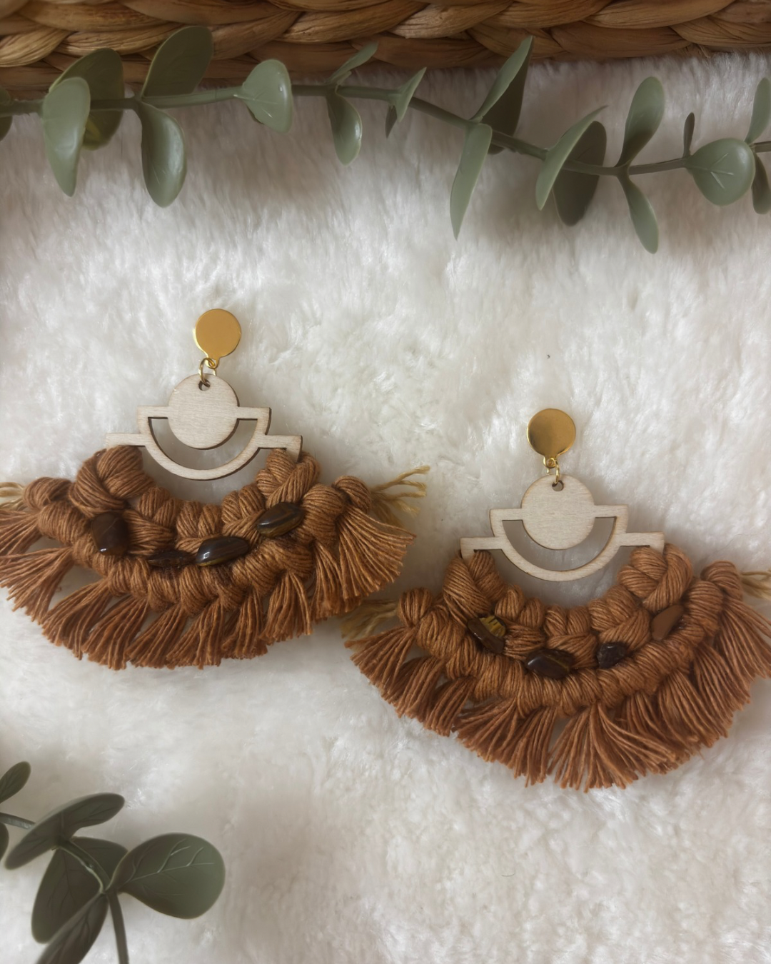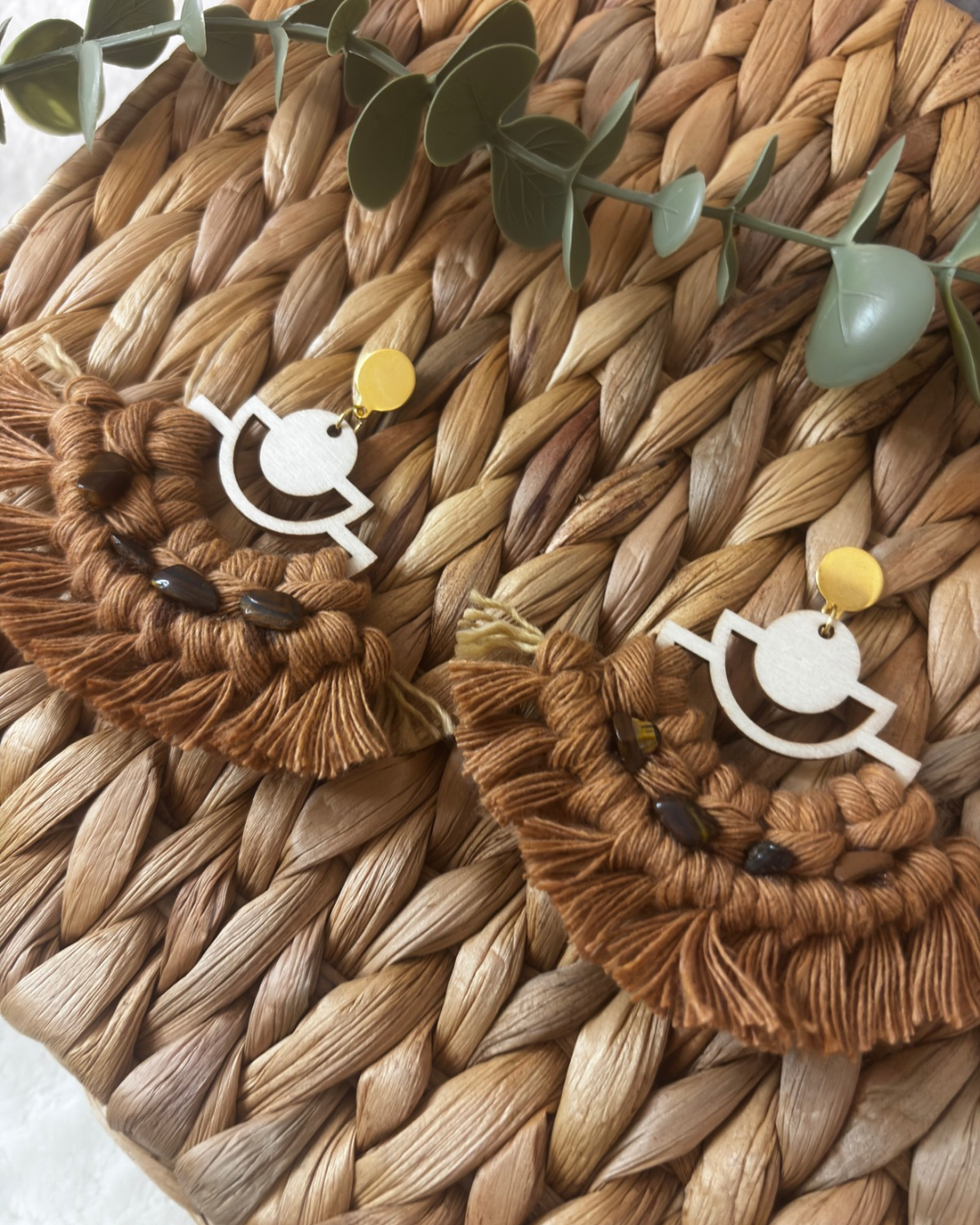 Tejidos a mano en tonos tierra y adornados con piezas naturales de Ojo de Tigre, estos aretes son un amuleto de protección, claridad y valentía.